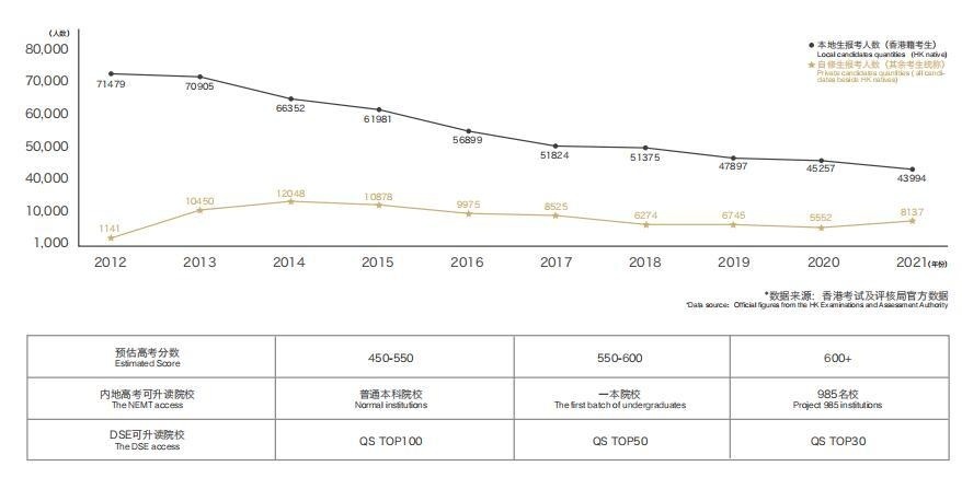 DSE香港高考:从2012年首届向内地生开放报考人数达到72,876人,到2020年跌至52,687人,降幅高达28%,随着香港出生率的持续低迷,内地考生选择参加DSE香港高考的竞争压力会较为缓和。