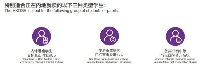DSE是最适合内地考生的国际升学考试HKDSE香港中学文凭考试,即香港高考,简称DSE,与IB、A-Level、SAT等国际升学考试⻬名,是全球唯一一个可以选择中文试卷考试并以中文作答的国际升学考试,成绩受香港、澳门地区以及全球QS名校认可,2012年对内地高中学生开放,课程全面衔接内地初高中课本知识,是中国学生最优的国际中文升学路径。