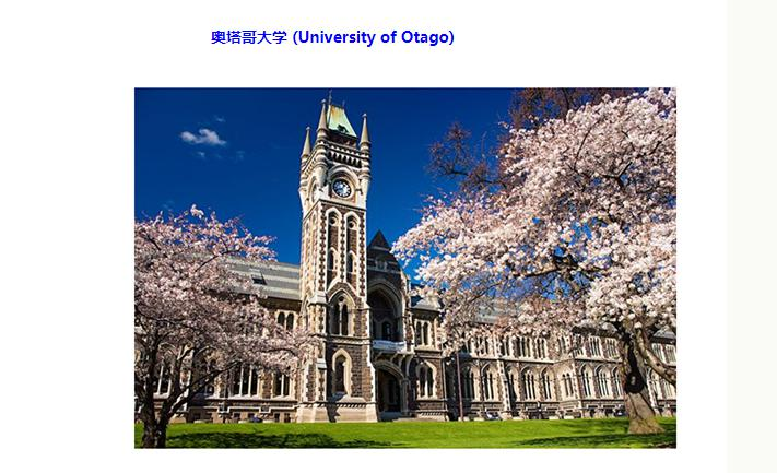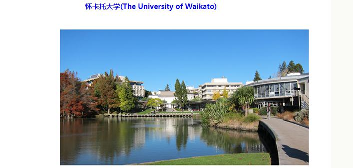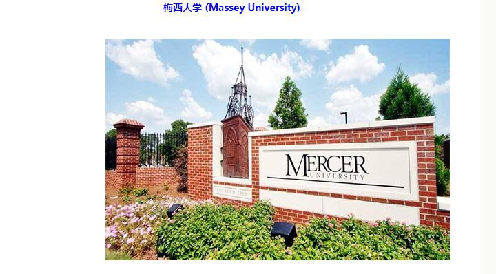 大学介绍:建成时间:1927 年学校性质:公立坐落位置:北帕默斯顿学生人数:约 40000 人,其中国际学生约 4000 人校区:3 个(北帕默斯顿、奥克兰、惠灵顿)大学优势:• 是新西兰的一所教育和研究学府,有新西兰的商学院;• 由于学校教学注重实际,与工商企业和社会各界紧密,实习机会多;• 学校的硕士和博士生教育实力雄厚,每年培养出的博士生数量居全国之首;• 学校有不断发展和创新的传统,所从事的科研项目每年以 15%的速度增长。优势专业:商科、教育、管理、工程、信息工程、法律、生物技术方式::