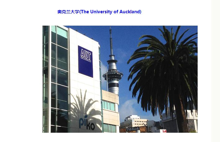 大学介绍建立时间:1883 年学校性质:公立坐落位置:奥克兰学生人数:约 33000 人,其中国际学生约 5500 人校区:6 个(City Campus, Grafton Campus, Tamaki Innovation Campus, NewmarketCampus, Epsom Campus, Tai Tokerau Campus)大学优势• 根据 2017-2018 年 QS 世界大学排名,奥克兰大学是新西兰的大学,全球排名 82;• 是新西兰拥有专业最多的、专业设置最全的大学;• 奥 克 兰 大 学 是 目 前 新 西 兰 唯一 的 加 入 世 界 二 十 一 世 纪 大 学 协 会(Universities21)和环太平洋大学联盟(Association of Pacific Rim Universities)的大学;• 学校环境国际化、多元化,易于学生交流。优势专业电子商务、国际贸易、商科、会计、MBA 、计算机、和电子工程等