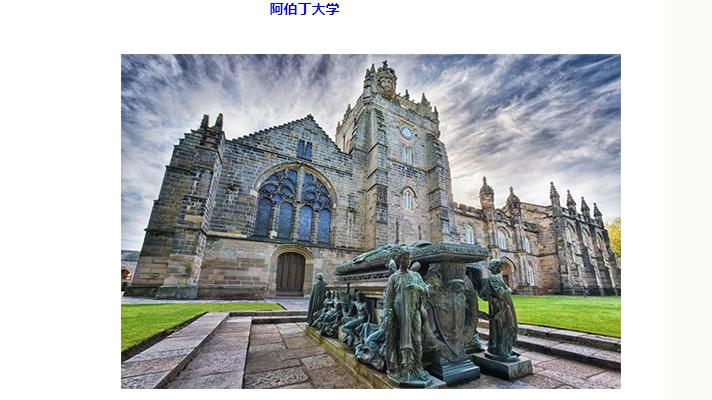 大学介绍:阿伯丁大学于1495年在苏格兰阿伯丁创立,是著名的教育和研究中心。该校是中世纪创建的四所苏格兰古大学之一,也是全英校龄第五长的大学,学生总数近14000名。该大学的教学和研究质量举世闻名,拥有五名诺贝尔奖得主。在最新的世界权威大学排名中:2019QS世界大学排名172。其中阿伯丁大学的医学享有盛誉,设有英语系国家所医学院,胰岛素和核磁共震都是由阿伯丁大学教授发明的。法学院被认为是英国的法学院之一,所开设的国际法和商法尤其适合中国学生学习。石油工程专业全英第二,就业机会多。大学优势:教学质量杰出,专业设置齐全,列为英国的20个明星大学之一。该学校450个本科和研究生专业中89%的专业被评为优秀或优良。对所有国际学生提供四周免费课前英语强化课程。入学要求:语言要求:本科生:IELTS 6分(写作不低于6)