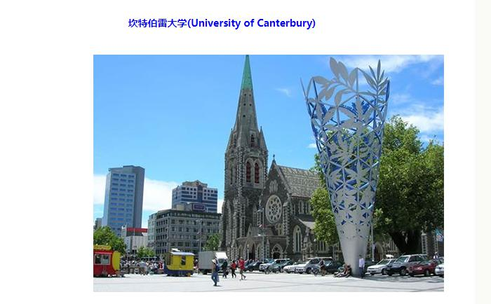 大学介绍:坎特伯雷大学建于1873年,学生20000人,以工程专业最为出名。位于新西兰的坎特伯雷省的省会基督城中,原来坐落在基督城的中部,1974年迁到ilam区。由此去市中心极为方便,去参加包括到哈特山上滑雪等一系列文化娱乐活动也相当容易,基督城是去南阿尔卑斯山,库克山和皇后镇的必经之地。基督城有基督城国际机场,城市坐落在坎特伯雷平原伸向大海的尖角处。大学优势:• 2017-2018年度QS世界大学综合排名214位,也被列为世界前1%的大学。• 教育学(Education)和土木工程(Engineering Civil and Structural)排名前100,会计与金融(Accounting & Finance)、英语语言文学(English Language and Literature)社会学(Sociology)排名前150。• 坎特伯雷大学以工程闻名,是新西兰数一数二的工程大学,并被认为是世界上的大学工程系之一;• 学校坐落在基督城,也称花园城,为全国第二大城市,民风保守但友善,城市治安优良;• 传统英式教育,注重学生的表现;• 重视中国留学生,学校内有中国留学生的辅导,专门照顾中国留学生日常生活和学习的需要;优势专业工程、会计、金融、管理