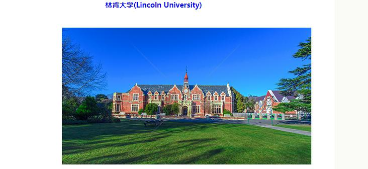 大学介绍:建成时间:1878 年学校性质:公立坐落位置:距离基督城市中心约 20 公里学生人数:约 4000 人,其中国际学生约 1000 人大学优势:• 良好的学习氛围。新西兰不仅是世界上最适合人类生活居住的国家之一,也是世界上最适合留学的国家之一。相对于欧美较高的学习生活费用,新西兰的费用比较适中,同时新西兰大学的学历被世界广泛认可;• 林肯大学课程研究领域相对集中在传统和新兴产业经济,这样就可以在这些经济产业领域中集中优势培养国际化人才和世界科研成果,为经济社会的发展提供人才和技术研究的;• 林肯大学的师生比例保持在相对较低的程度。学生都有充分的机会与教授讲师进行面对面的交流。林肯大学面积适宜的校园了所有学生都能接触到不同文化交流的和谐氛围;• 林肯大学的许多课程需要学生完成实习工作要求,这样学生能将课堂上所学的知识及时实际,为毕业后就业做好充分准备。优势专业:商科、农业、葡萄酒栽培与酿造、自然景观、园艺学。