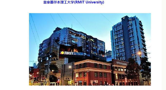 皇家墨尔本理工大学是澳大利亚一所城市化,多元文化的大学。大学的基础设施完备,通讯系统发达。其为学术界、政界、商界输入大量优秀毕业生,并因其就业率高居澳大利亚榜首而闻名遐迩。大学拥有5个校区、3大学院、17个科系,并与49 个国家的超过200所院校有交换合作项目。在 2017 年 QS 世界大学专业排名中,RMIT 艺术与设计项目位居澳洲,全世界17。建筑与环境建造项目位于澳洲第4,全世界28。该大学和政府部门,工商界以及社区群众紧密,并且为后者提供各种服务。优势专业:传媒,会计, 物流与供应链管理,工程,信息技术,化学,电子电气,航空航天,商业管理,公共关系, 设计(室内设计、建筑设计、服装设计、平面设计、景观设计等),计算机商业信息系统,社区服务,心理学,食品科技,地理空间,环境,土地测量,教育等。入学要求:6.5 分(各单项不低于 6.0 分),其中个别专业要求雅思 7.0-7.5