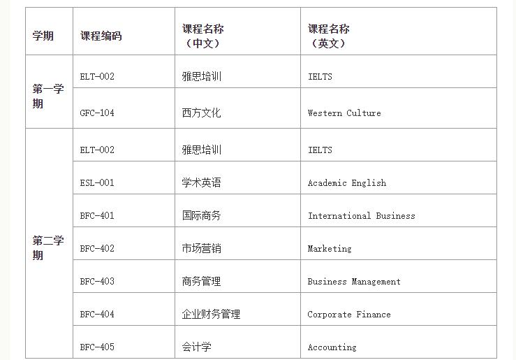 金融管理、项目管理、商务管理、国际金融、旅游管理、酒店管理、市场营销、管理与市场营销、工程商务管理、人力资源管理、会计等。