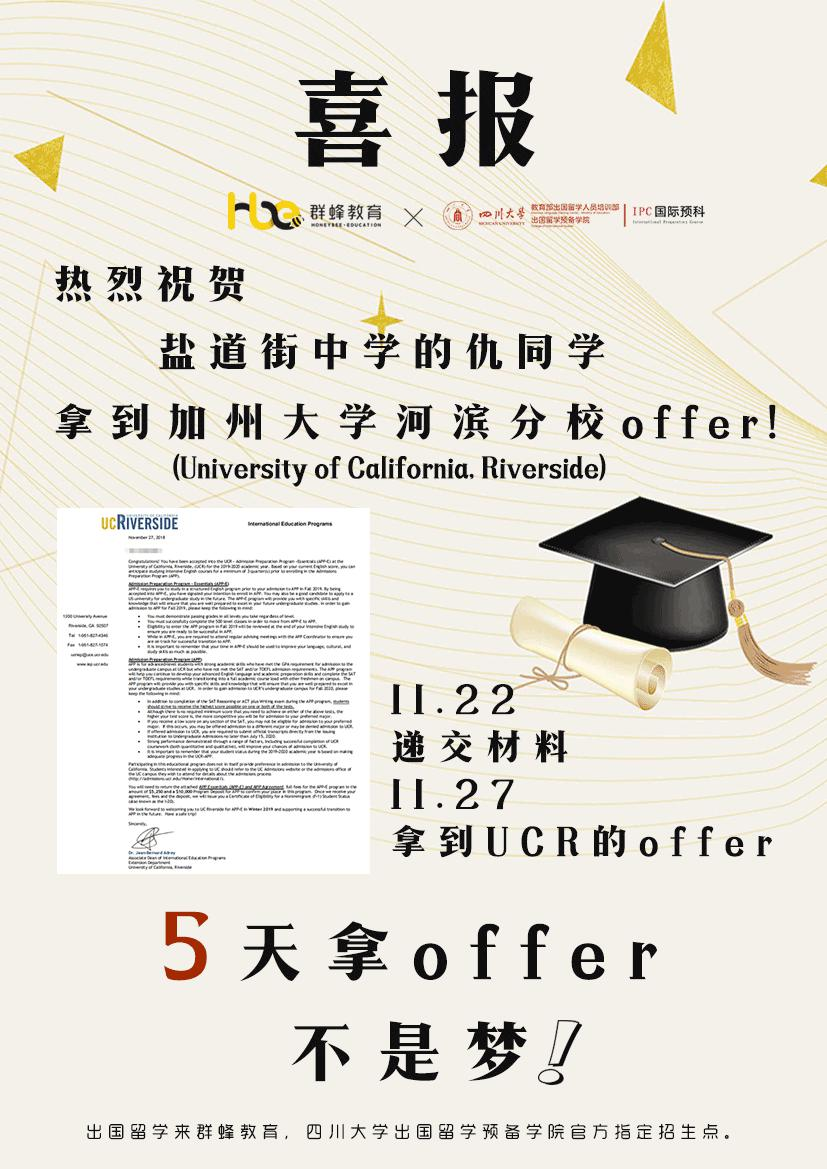 热烈祝贺仇同学拿到加州大学河滨分校offer
