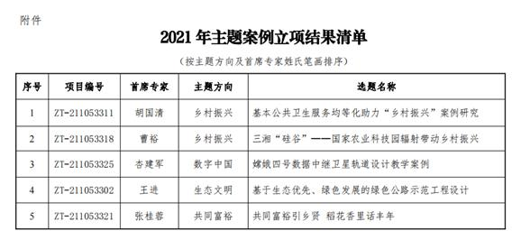 通过科学谋划、积极动员、精心准备,共有32项案例参与此次征集,经校内专家评审,学校共推荐6项主题案例参评,最终由胡国清、曹裕、杏建军、王进、张桂蓉五位专家教授牵头申报的案例分别入选“乡村振兴”、“数字中国”、“生态文明”、“共同富裕”四大主题。
