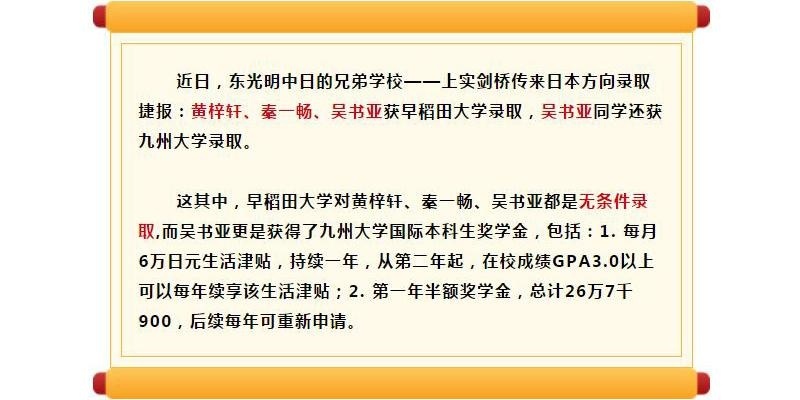 上实剑桥国际高中与东光明中日国际高中同属上实剑桥教育集团。作为英美方向留学的头部国际学校,有沪上A-level“三大金刚”之称的上实剑桥,每年亦有不少优秀学生备受日本名校青睐,本次被早稻田、九州大学录取的这三位同学便是其中的代表。
