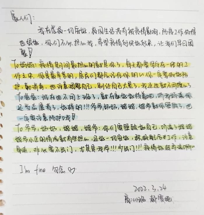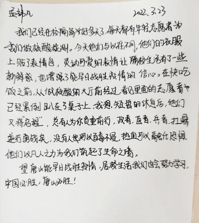 虽然疫情很紧张,但是请爸爸妈妈以及老师们放心,少年终会长大,我们会在校园里认真学习,好好吃饭,照顾好自己。因为我们知道,星光不会辜负每一个追逐梦想,目光坚定的少年,我们的征途,需要靠自己一笔一笔去描摹,而我们,也定会描绘出独属于自己的画卷。